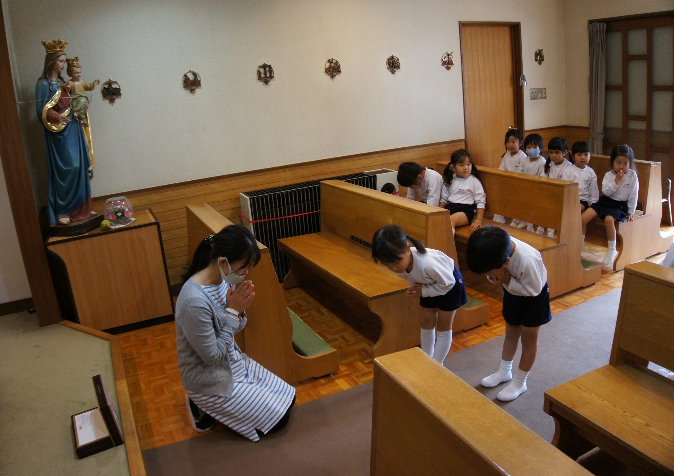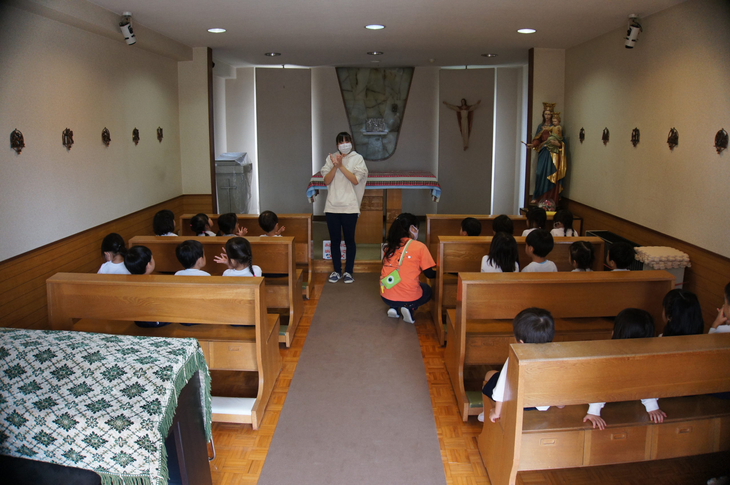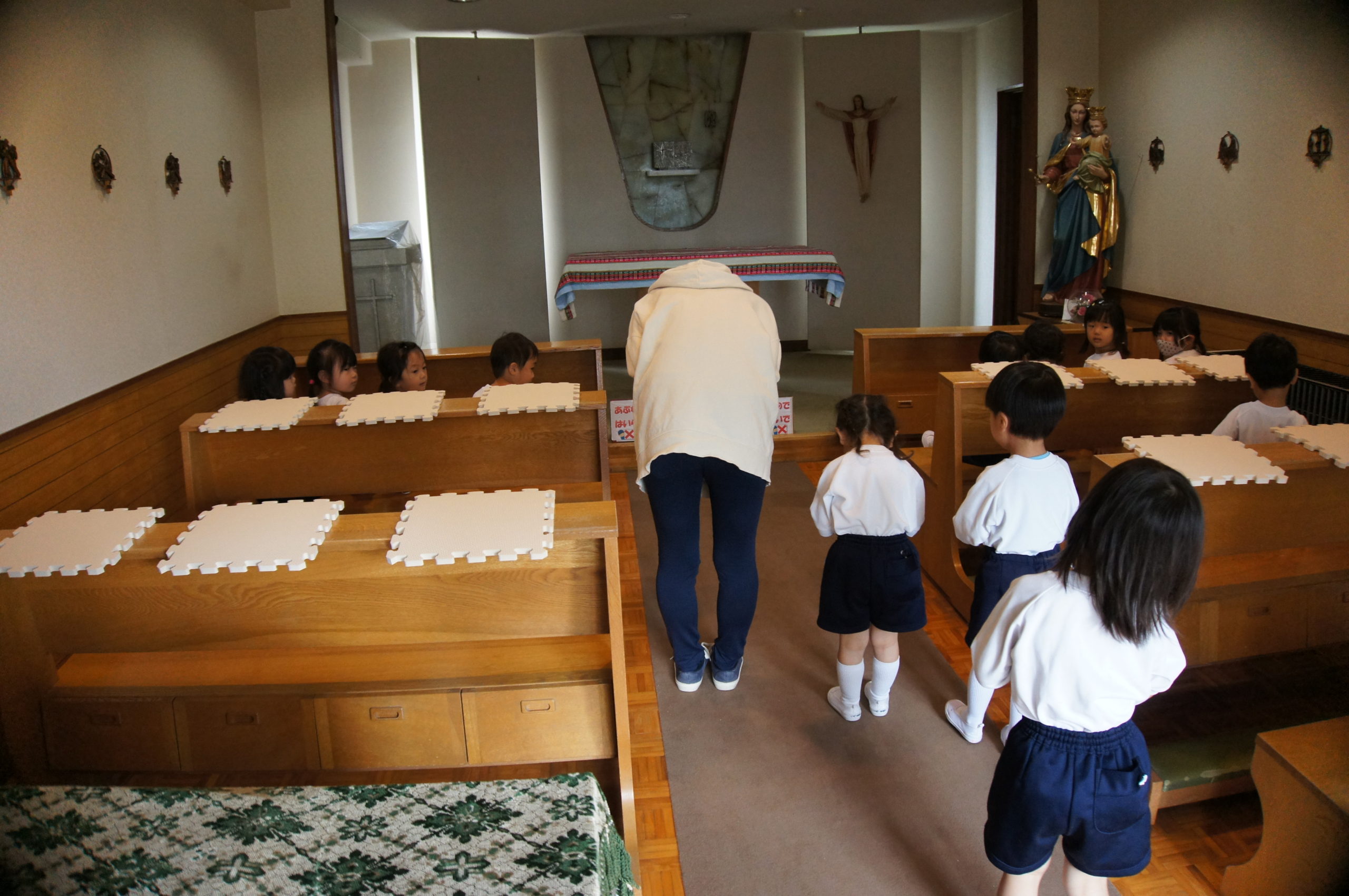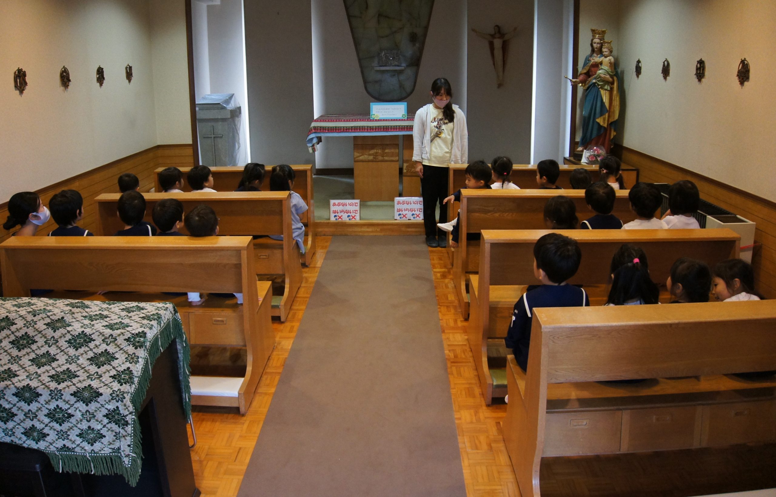 お聖堂は神様のいるお部屋だから、静かにしないといけないんだよ![]()