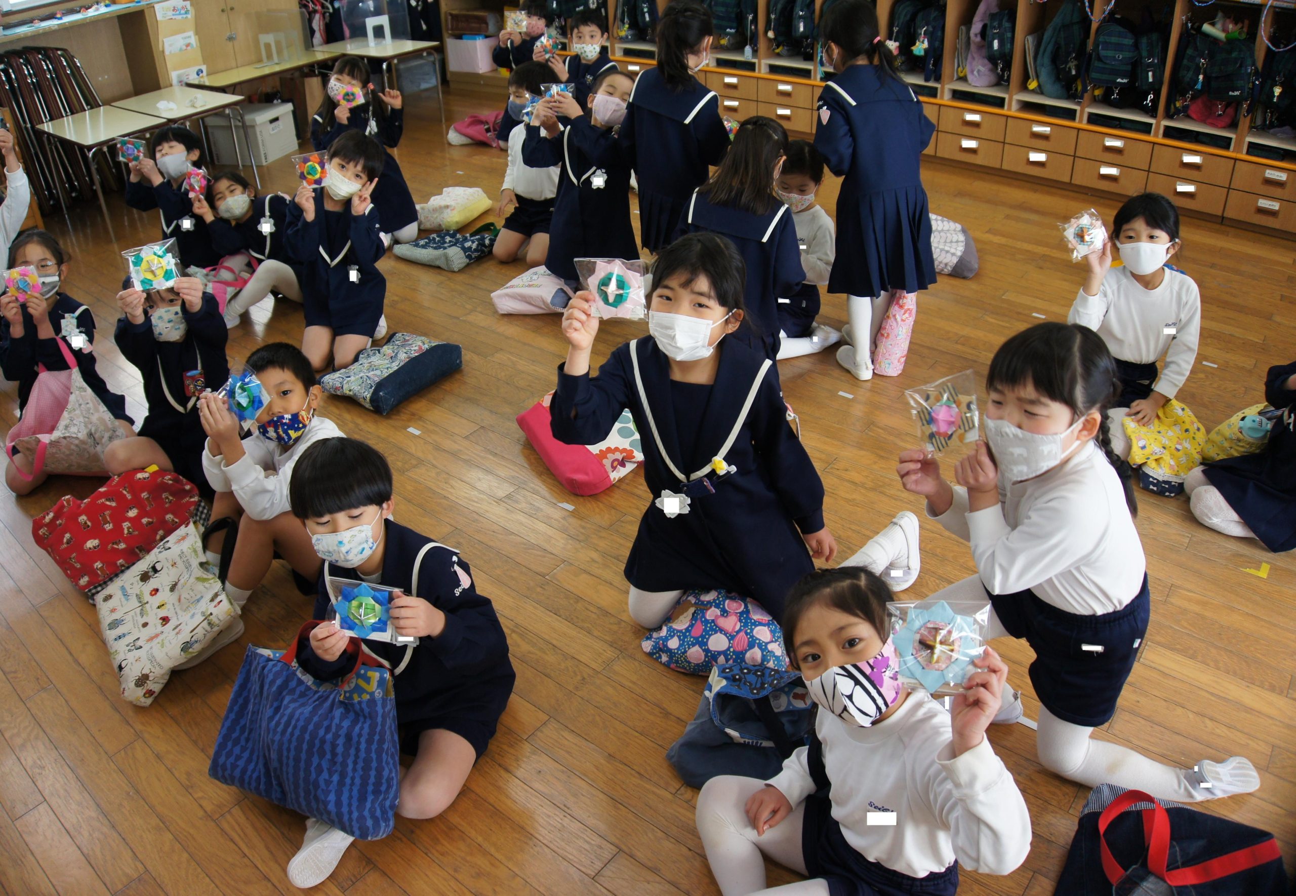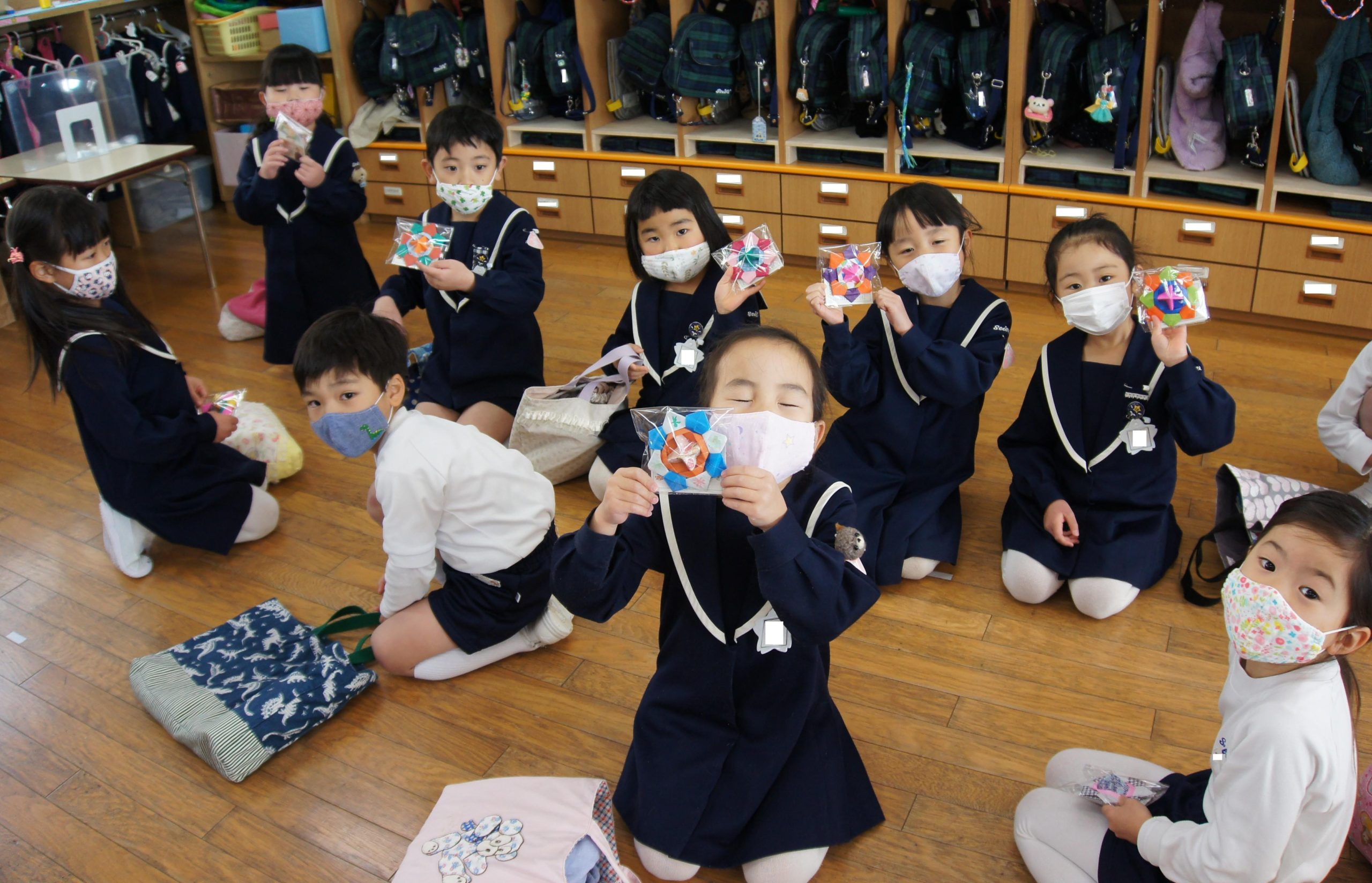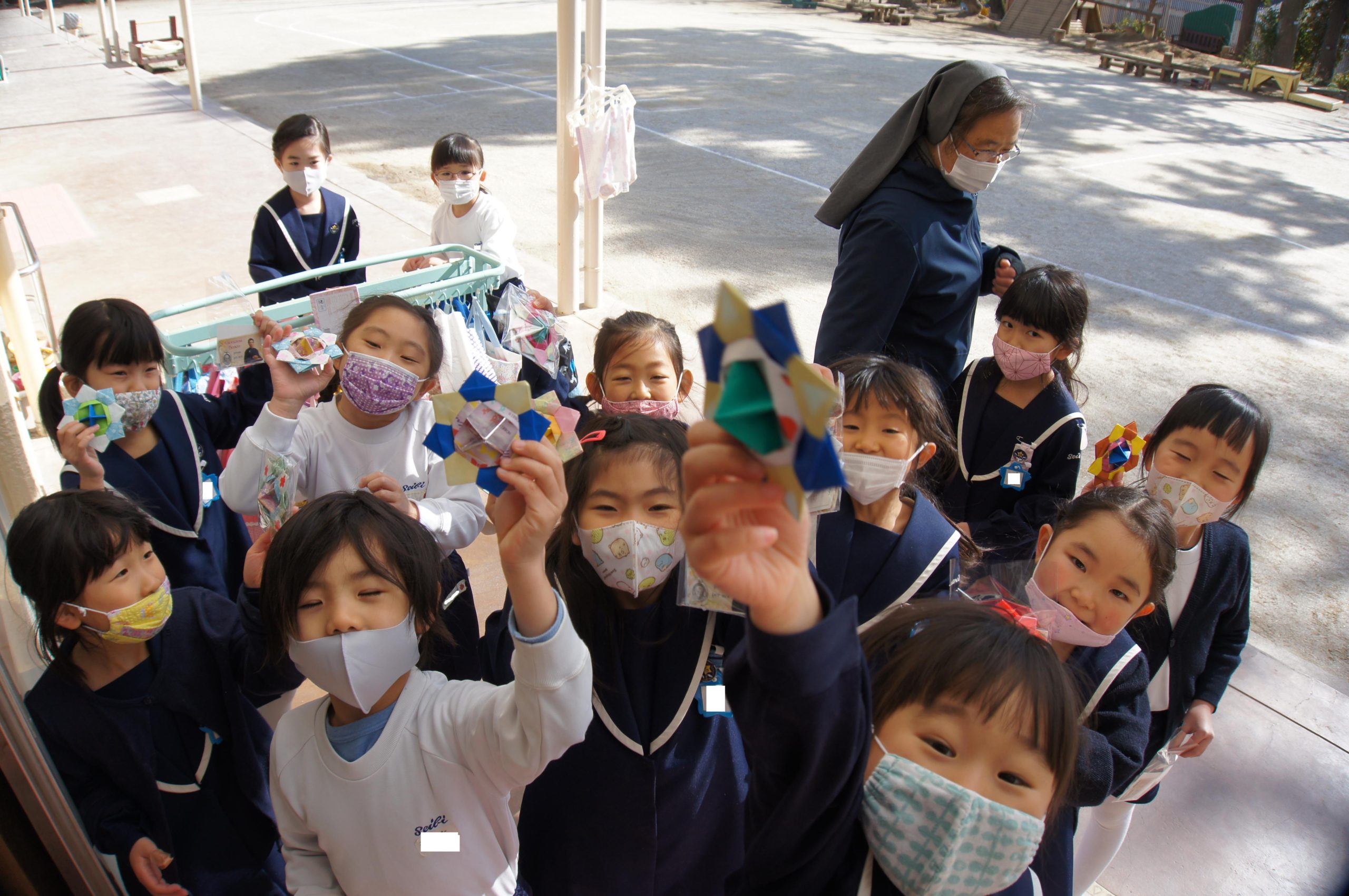 嬉しいお祝い日なので、みんなにドン・ボスコのカードとシスターが子ども達のために心を込めて作ってくださった折り紙コマのプレゼントを渡しましたよ![]()